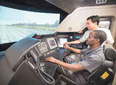 日前,來(lái)自泰國(guó)、斯里蘭卡、老撾等13個(gè)國(guó)家的63名鐵路管理人員來(lái)到武漢高鐵訓(xùn)練段進(jìn)行參訪交流活動(dòng)。在“一帶一路”背景下,2015年開(kāi)始武漢高鐵訓(xùn)練段已舉辦了泰國(guó)、老撾等14批涉外鐵路技能培訓(xùn)班,培訓(xùn)涉外學(xué)員400余人次。圖為來(lái)自肯尼亞的賈斯特斯·卡洛·姆文加在高鐵模擬駕駛倉(cāng)內(nèi)體驗(yàn)實(shí)際操作。 新華社記者 肖藝九攝
