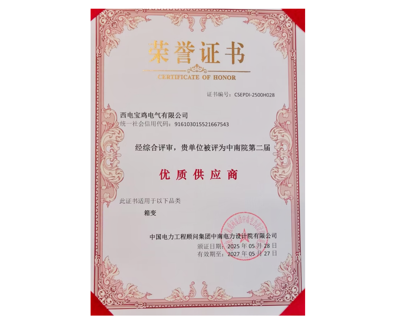 近日,西電寶雞電氣在中國電力工程顧問集團中南電力設(shè)計院有限公司(以下簡稱“中南院”)2025年度供應(yīng)商大會上,憑借卓越的產(chǎn)品品質(zhì)、高效的交付能力和優(yōu)質(zhì)的服務(wù)水平,連續(xù)第二年被授予“優(yōu)質(zhì)供應(yīng)商”榮譽稱號。這一殊榮的蟬聯(lián),不僅是對西電寶雞電氣多年來深耕行業(yè)、匠心服務(wù)的高度認可,更標志著雙方合作邁入全新里程。