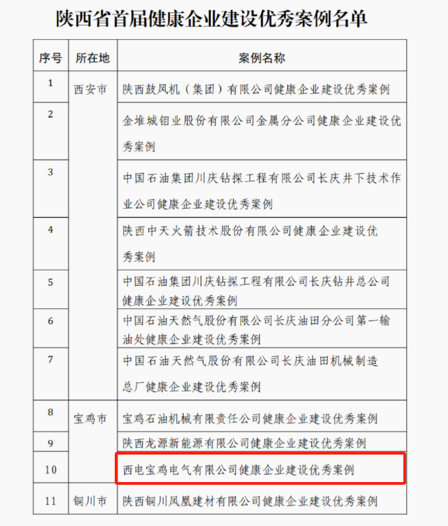 近日,Good news在陜西省衛(wèi)健委組織開(kāi)展的健康企業(yè)建設(shè)優(yōu)秀案例征集活動(dòng)中,西電寶雞電氣脫穎而出,成功入選陜西省首屆健康企業(yè)建設(shè)優(yōu)秀案例名單。這一榮譽(yù)不僅是對(duì)企業(yè)以人為本、關(guān)愛(ài)員工健康理念的高度認(rèn)可,更為省內(nèi)企業(yè)健康建設(shè)樹(shù)立了示范標(biāo)桿。