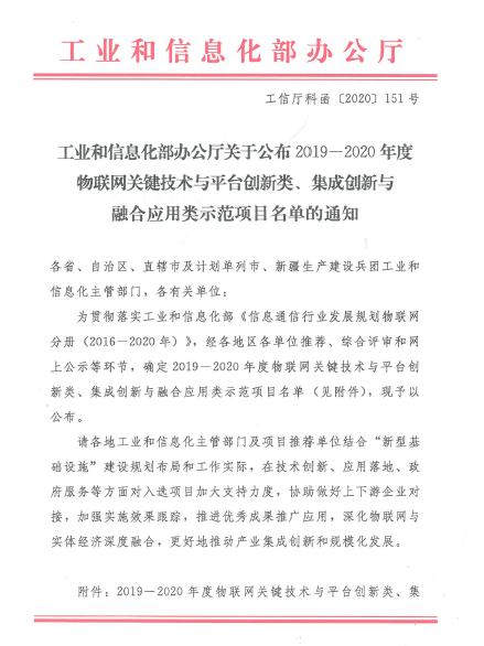 2019年9月,國家工業(yè)和信息化部開展2019年物聯(lián)網(wǎng)項目征集工作,向國內(nèi)征集具有示范效果、市場影響力、產(chǎn)業(yè)帶動性等要素,具備模式復(fù)制和應(yīng)用推廣基礎(chǔ)條件的在建或建成項目。公司積極響應(yīng),根據(jù)文件要求,對項目的技術(shù)資料、公司財務(wù)報表、納稅證明、榮譽證明等資料進(jìn)行了詳細(xì)收集梳理,最終公司所遞交、填報的資料成功通過了專家評審,成功入選示范項目名錄。
