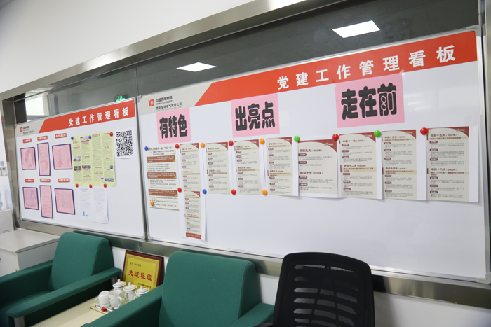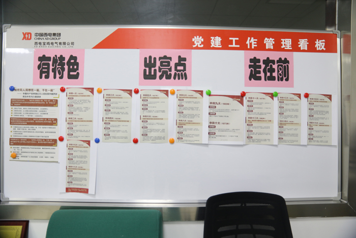 經(jīng)過西電寶雞電氣辦公樓三層西頭,大家不經(jīng)意間會發(fā)現(xiàn)兩個展板上展示著幾句鏗鏘有力的宣傳標(biāo)語“黨建增進(jìn)實(shí)力、黨建彰顯魅力、黨建激發(fā)活動”“聚精會神抓黨建、專心致志搞經(jīng)營、一心一意謀發(fā)展”,這只是看板背面,走進(jìn)西電寶雞電氣黨群工作處,兩塊黨建工作管理看板正面一下子映入人的眼簾,吸引人的眼球,“有特色、出亮點(diǎn)、走在前”九字工作方針更是格外醒目,公司黨委組織架構(gòu)、黨員構(gòu)成、年度工作目標(biāo)、年度重點(diǎn)工作,月度重點(diǎn)工作,本周主要工作、黨建督查情況反饋、宣傳簡報、喜迎十九大等欄目排列有序、圖文并茂、內(nèi)容詳盡。